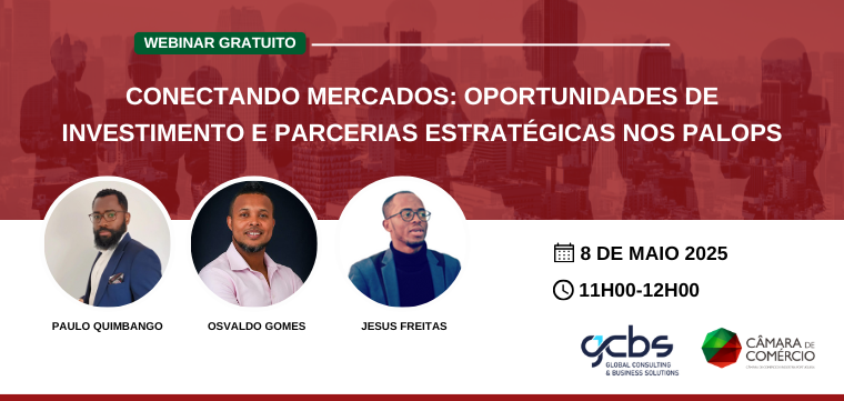O Grupo Internacional Afrodescendente (GIA), a GCBS (Global Consulting & Business Solutions) e a CCIP convidam empresários, investidores, empreendedores, decisores políticos e todos os interessados para um Webinar que pretende dar a conhecer as oportunidades de internacionalização de e para África Lusófona.